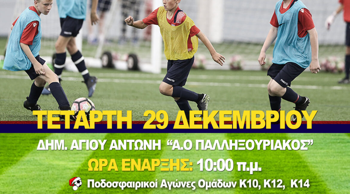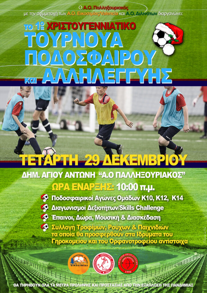 Ο Α.Ο. Παλληξουριακός με την συνδρομή των ΑΟ Εικοσιμίας Ακαδημίες Βαλένθια-Κεφαλονιάς και Α.Ο. Διλινάτων -τους οποίους κι ευχαριστεί θερμά- διοργανώνει στις 29 Δεκεμβρίου και ώρα 10:00 π.μ. στο Δημ. Αγίου Αντώνη “Α.Ο. Παλληξουριακός” το 1ο Χριστουγεννιάτικο Τουρνουά Ποδοσφαίρου & Αλληλεγγύης για αθλητές από 8-14 χρονών.