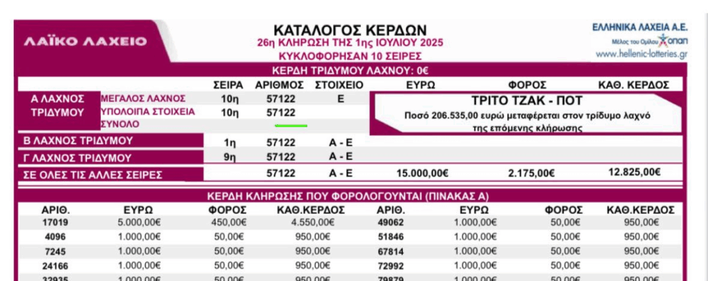 Ο Αργύρης ήταν ο μεγάλος νικητής της λαχειοφόρου που προέκυψε την Τρίτη 1/7 από την κλήρωση του Λαϊκού Λαχείου.